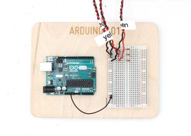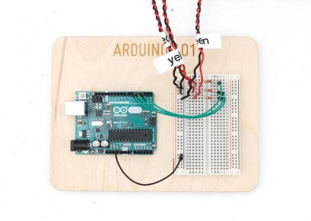 Para terminar este paso vamos a utilizar cables de puente de los pines 3, 4 y 5 para el rojo, amarillo y verde LED.
