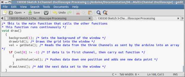 Dependiendo de cuántos canales quieres tener, subir a uno de los "bosquejos de Arduino" se muestra a continuación en su Arduino. El código de envío y recepción de los datos se basó en el código de este capítulo del gran libro que explica cómo enviar varios campos de texto de un Arduino al ordenador y procesado con el proceso.