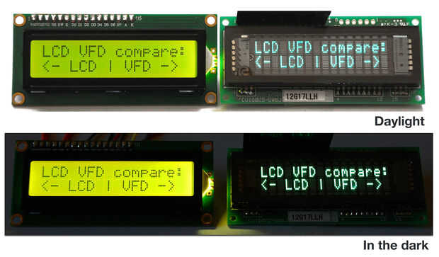 Mira las fotos de arriba que tomé si no has visto cómo VFD muestra parecen todavía. El primero de ellos muestra cómo VFDs ven diferentes comparado con pantallas LCD y el segundo muestra cómo su reloj podría parecer después del montaje.