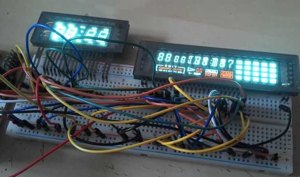 Salvado mina de mucha chatarra electrónica vieja que tengo fuera de eBay realmente fui por algunos vintage CPUs para mi Museo de CPU pero la pantalla llegó con el lote así que decidí convertirlo en algo útil otra vez. Saqué esta particular exhibición de VFD (es un FIP4B08 NEC) fuera un PCB que podría perteneció a algún dispositivo de electrónica de hogar - algo que tenía la capacidad de contar el tiempo, pero no era un reloj sí mismo. Posiblemente un horno de microondas. Puede ver el circuito queda en la foto derecha inferior.
