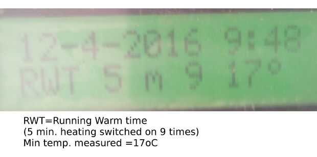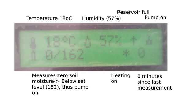 Si el botón se pulsa en el modo de hidroponía: muestra la fecha actual y el tiempo total de la calefacción se enciende y el número de veces que se conecta desde la medianoche. También muestra la temperatura mínima que se mide desde la medianoche, o desde el dispositivo fue encendido, el que sea más corto.