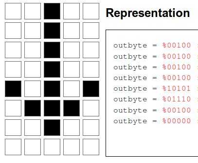 Como he querido un personaje de 'grado' adecuado para Celsius (check año LCD carácter 123, tal vez es adecuado para usted), estaba de suerte como la pantalla LCD permite la definición de 8 caracteres de usuario. Decidió hacer una flecha como indicación visual de un tanque vacío. Con respecto a la definición de caracteres de la pantalla LCD, que es simple de hacer con la biblioteca de Malpartida en binario - hexadecimal convertidor, uno puede entonces encontrar el equivalente hexadecimal del número binario, pero uno puede enviar directamente el número binario.