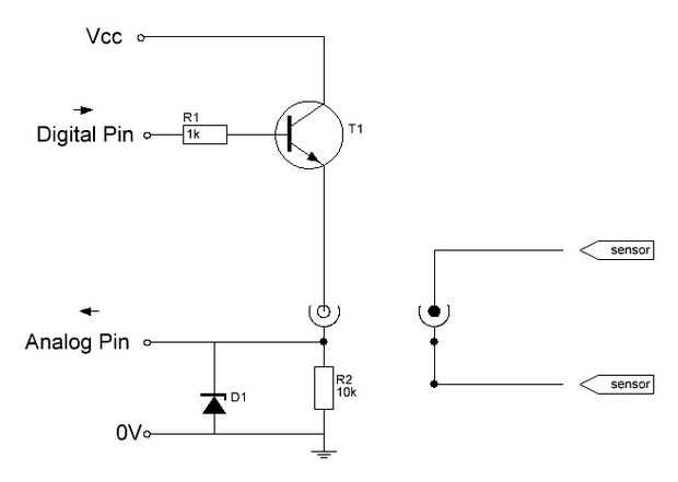 Eso es lo que yo he elegido para este diseño: el transistor utilizado como un llamado 'seguidor emisor'. Seguidores de la emisor funcionan como tampones de voltaje. Se abre por un alto nivel de un pin digital. El emisor entonces es tirado alto (alrededor de 4,5 voltios). Este voltaje se alimenta entonces en el sensor (los dos pernos en el suelo) y luego se lee el voltaje sobre la resistencia de 10 k por un pin analógico. El transistor es básicamente cualquier tipo de barato transistor NPN de señal como un BC107 o un BC547. Usé un VN147 un transistor 'NPN universal' 30 año de edad, por ninguna otra razón que tenía poner todo y me gusta un poco la forma del triángulo tiene.