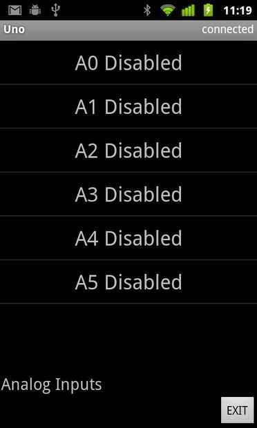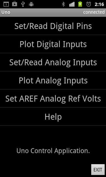 f) Descargar e instalar pfodApp de GooglePlay o SlideMe en tu móvil Android (Android V2.1 y arriba). Seguir pfodAppForAndroidGettingStarted.pdf para sincronizar tu móvil con el escudo de Bluetooth y configurar una nueva conexión de pfodApp, llamé a mina "Uno". Finalmente haga clic en la conexión de Uno para conectar a la placa Uno vía bluetooth.