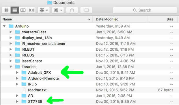Cada biblioteca de descargar y descomprimir las carpetas. Renombrar a "Adafruit_ST7735" y "Adafruit_GFX" y coloque cada carpeta dentro de la carpeta de las bibliotecas de Arduino. Os he adjunto una captura de pantalla de las bibliotecas en la carpeta correcta. Una vez instalado, estás listo para operar la pantalla! Dentro de la Adafruit ST7735 biblioteca es un archivo llamado graphicstest.ino que puedes subir a tu Arduino y se ejecutará a través de una serie de funciones que dibujar los objetos en la pantalla. Sin embargo, este archivo va a necesitar algunos modificar para adaptar los pines a tu disposición.