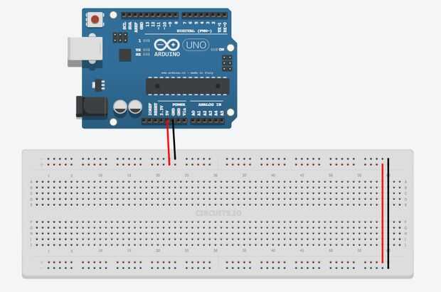 Una cada lado de la placa, dos filas de agujeros están conectados a través de toda la longitud de la Junta (imágenes 1 y 2). Generalmente, conectará estos "raíles" largo a 0V (también llamado "tierra") y lo que voltaje utiliza para la energía (en esta clase se utiliza 5V de Arduino), para que esas conexiones están disponibles en todas partes en el tablero. En este caso, lo primero que quieres hacer es alambre estas conexiones a tu Arduino como se muestra en la imagen 4, observe cómo conecté tierra a la fila con "-" y 5V para la fila marcada "+", tu protoboard puede o no puede etiquetarse. Nota: a veces estos lado tiras sólo se extenderán a medio camino a través de un tablero más largo, usar cables para completar la conexión (imagen 5).
