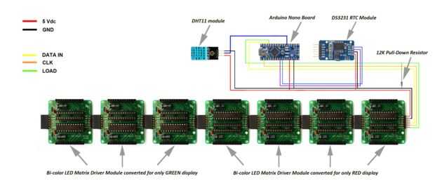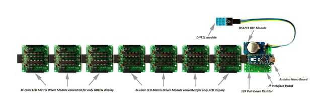 La primera foto de arriba muestra el diagrama de cableado en cómo los módulos de matriz de LED, los módulos de reloj y temperatura y humedad son conectado a Arduino Nano.