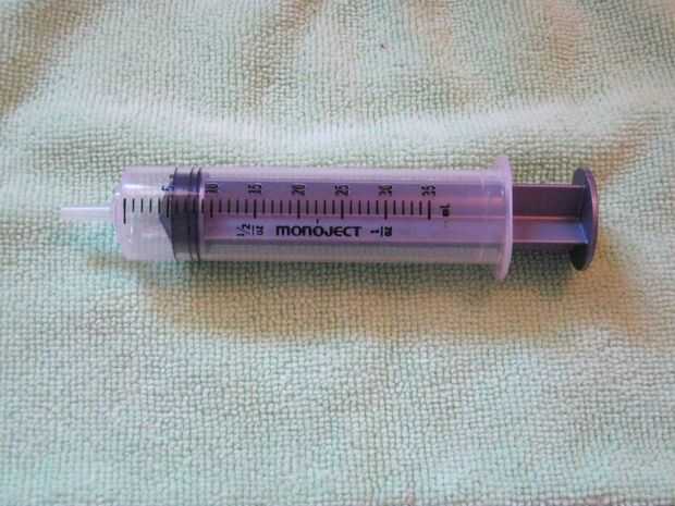 La jeringa es realmente ganado en jeringa de uso veterinario. Soy veterinario, cerca lo suficiente. En realidad, esto funcionó bastante bien para calibrar mi pluviómetro.