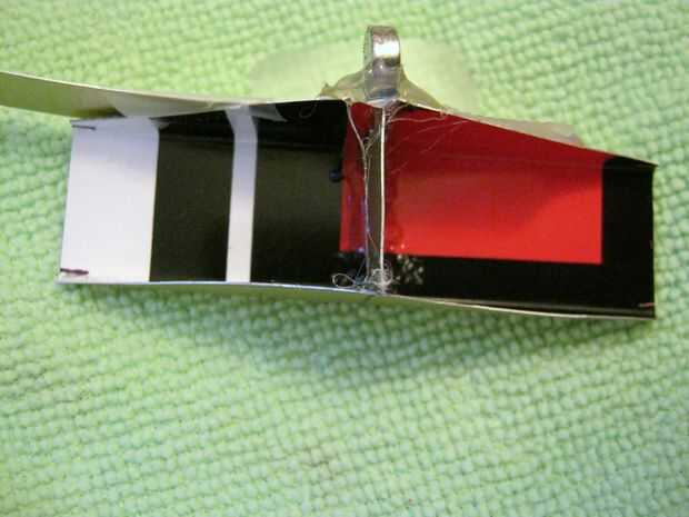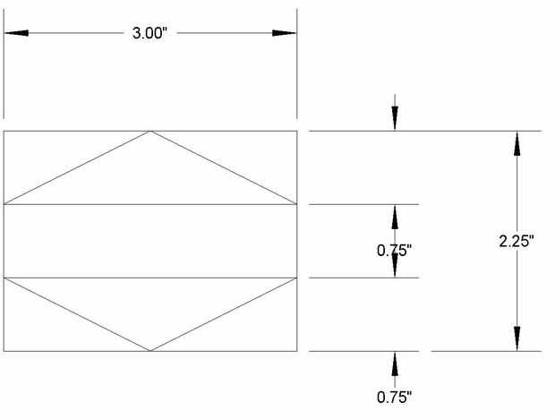 Para hacer mi cubo que inclina, tomé un pedazo de la muestra 'NoTrespassing' de aluminio, que utilicé para mi veleta. Marqué una pieza rectangular 3 "x 2,25" como se muestra en el diagrama. Yo con un par de tijeras y dobla hacia los lados. Me ha pasado tener un pedazo de ¾" de aluminio, utilizado para formar el canal y doblar los lados hacia arriba. Luego recortan los lados por lo que fueron triángulos. Corte otro pedazo de aluminio ¾" cuadrado, redondea las esquinas inferiores y caliente pegado en el medio para que tengas dos 'cubos'. Vea la primera foto.