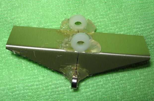 La siguiente foto se ve un poco raro. Quería usar a espaciadores de nylon para el punto de pivote pero mi ferretería Ace no cualquiera. Tienen estas arandelas de nylon #8 que son aproximadamente 1/8" de espesor por lo que he comprado. Quería que los espaciadores que sobresalen de los lados del cubo que inclina de modo que grabó otro desecho de la muestra para el cubo que inclina entonces yo había aprovechado la lavadora por lo que fue con la chatarra. La cinta adhesiva se ve bastante rara en esta foto. Luego caliente pegar la arandela en la parte inferior de la Asamblea del cubo e hizo lo mismo al otro lado.