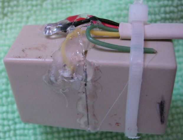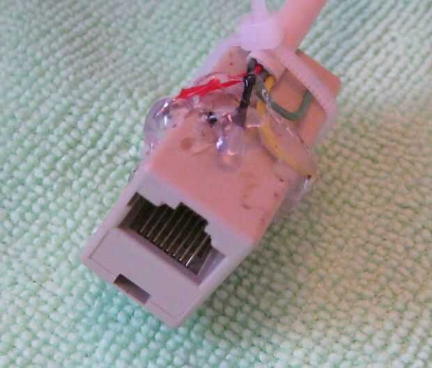 Dificultad alta: Para la estación 2, tuve un acoplador Ethernet cerca de la estación. Me decido a construir un acoplador especial para golpear ligeramente en por el pluviómetro. Apalancando con cuidado con una cuchilla Xacto y destornillador, el acoplador puede (probablemente) partir aparte. Hay ocho cables elásticos interior (no tomar una foto) que es una final y abajo en el otro para hacer contacto con los conectores de Ethernet estándar. Ahora si tienes suerte, pueden ser reales cables conectar los dos extremos. Mina tenía sólo un hilo elástico continuo en un canal. Soldado un cable al pin 1 (cable marrón) y otro al pin 2 (cable marrón y blanco). Tenga cuidado de que no están en cortocircuito a otros cables. Corté un agujero en la caja de plástico para estos dos cables. También doblar un extremo del pin 8 (naranja-blanco) y perfora un agujero para él. Entonces cerré cuidadosamente las dos mitades. Ahora desde el otro extremo del cable de teléfono conectado a la SS461C, conectado el cable rojo al pin 1, el negro al pin 2 y el amarillo al pin 8. Luego ohmmed hacia fuera todas las conexiones y cuidadosamente probados para cualquier cortos. Luego pegué caliente el exterior del acoplador. (Ver fotos)