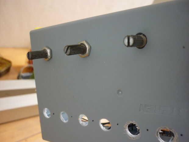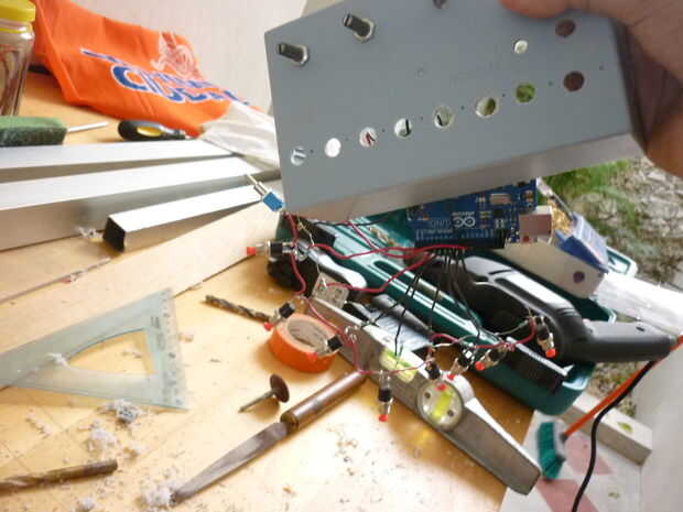 Hacer los agujeros es muy sencillo pero a veces puede ser tedioso, especialmente cuando hay muchos agujeros. Saqué una regla un dividido el cuadro 8, por lo que podía perforar 8 agujeros. Después de eso, sobre perforé dos agujeros para el interruptor de la pausa y el LED. Por encima de 4 agujeros para las macetas. Del lado de un agujero para la salida y debajo un cuadrado para el puerto usb de Arduino, así que puede alimentar energía a través de él. Después de poner todo en allí lugar resbalar en algunos mandos en las macetas y atornilladas siempre componente a la caja de plástico. Para hacer los agujeros; probar todo tipo de brocas para ver lo que se ajusta mejor a cada componente.