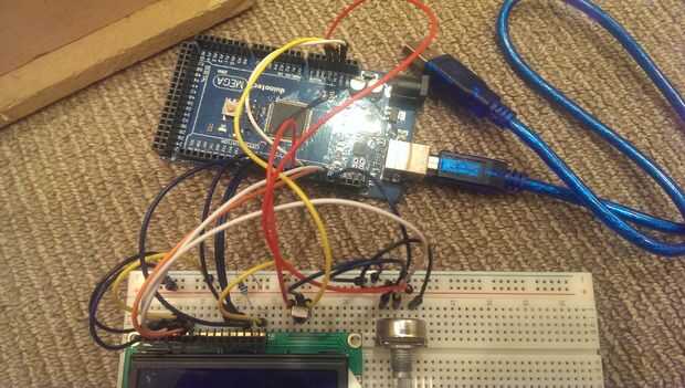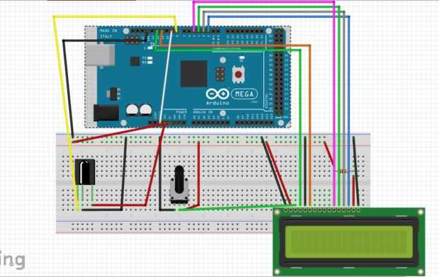 El cableado es bastante simple, es la habitual pantalla lcd cableado además de un receptor de infrarrojos en el pin 8 y un puente que va del pin 9 para reiniciar. He añadido un esquema de fritzing y una foto. Si tu LCD no tiene clavijas ya conectados debe insertar los pernos de la rúbrica a través de los orificios de LCD para conectar a la placa. Que tenga que jugar alrededor y empuje hacia abajo completamente para hacer la pantalla lcd. Realmente tuve que cambiar el cableado alrededor porque accidentalmente puse el agujero para el LCD en el lado equivocado, he incluyo una foto de los cables más recientes.