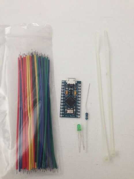 Ahora es el momento para conseguir el Arduino, LED y conexión de cable. También una adecuada resistencia para el LED.