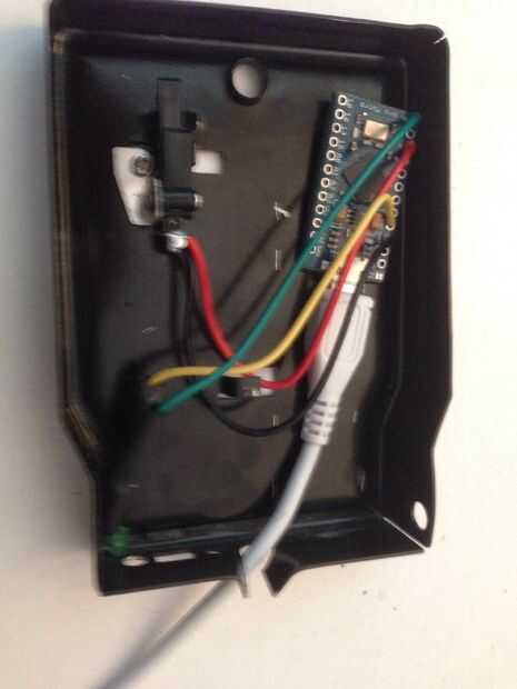 Inicialmente tenía planes de 4 agujeros en el Arduino, asegurándola con zipties. Desafortunadamente el metal era tan duro que mi dremel no podía perforar a través. Aislé el Arduino con un pedazo de caucho pegado a la parte inferior. Elimina el interruptor de polaridad y ampliado uno de los agujeros lo suficientemente grandes como para pasar el LED.
