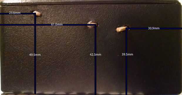 Perforaciones de 2mm en ambos lados del recinto según las especificaciones de la imagen de arriba. Las barras de metal irá aunque estos orificios, a través de los orificios de los botones e interruptores y el lado opuesto. Puede perforar un orificio en la tapa de la caja para mantener el LED RGB, y puede cortar un pequeño rectángulo en el lado del sensor de tacto. El altavoz y placa descansan en el interior del recinto.