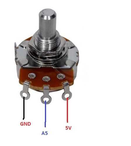Ahora vamos a añadir juego regulador que controla el cursor, para que estamos utilizando una olla, aquí estamos utilizando un bote k 10 se puede utilizar cualquier valor de pote que desee. Conectar la pata media de potes a Arduino Analpg Pin 5 (A5). Y otros dos, uno a otro es Gnd 5v