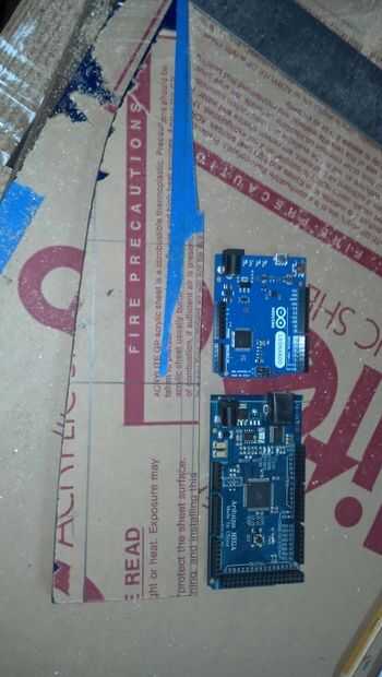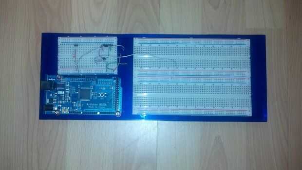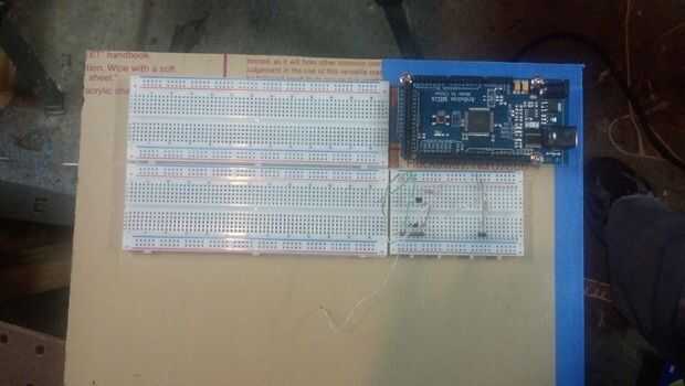 Algunas de las máscaras fue pelada hasta alrededor de las esquinas por lo que había reparado con corte y cinta de algún pintor azul antes de empezar la marca. Esta pieza tenía una gran curva hacia arriba, así que decidí cuadrado hasta el final y conseguir algunos de los pedazos más pequeños que necesitan de este pedazo de chatarra. Tomé algunas de las breadboards y un Arduino y había marcado mi siguiente corte.