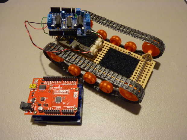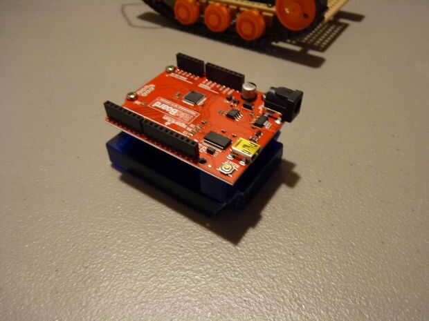 Este Velcro funcionó tan bien, que decidí utilizarlo para mi placa de Arduino en mi chasis de tanque. Esto es grande porque puedo tomar el stand de Arduino en el chasis del tanque y pegarlo a la superficie de trabajo. En el futuro me gustaría tener un montón de estas tarjetas, todas de diferentes tamaños, que rápidamente pude poner proyectos juntos en.
