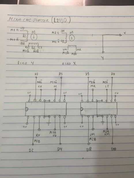 En los esquemas que tenemos los siguientes pines adjunto a la Junta: D2, D3, D4 y D5 - conexión a los pines de Arduino; M1A, M1A 'M1B y M1B' conexión de las bobinas A y B del motor de paso (eje y); Eje de D8, D9, D10 y D1 - conexión a los pines de Arduino; M2A, M2A 'M2B y M2B' conexión de las bobinas A y B del motor de paso (eje x)