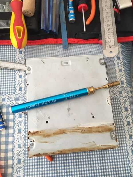 Después de realizar las perforaciones, es hora de soldar las estructuras uso un soplete y estaño para unir las partes de la estructura para formar una forma de "L" uso de la soldadura de flujo para ayudar en este proceso.