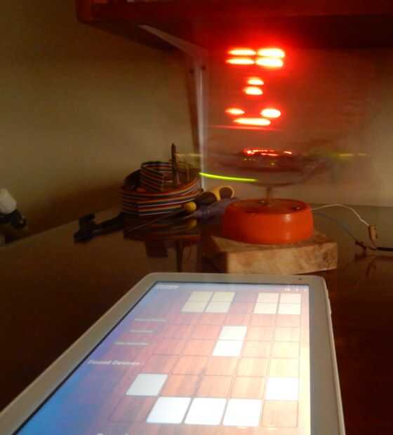 gran POV RGB pantalla construida para correr NMMU NDIP proyecto pizca 32 RGB LED de un microcontrolador PIC de 8 bits y un Texas instrumentos TLC 5945 LED driverhttp://youtu.be/O0l3VNwYpdA