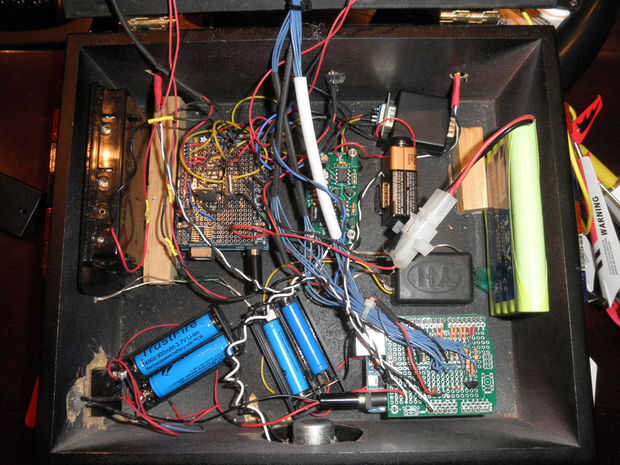 Un paquete de li-po de 12v alimenta el LED "luces de policía" en el exterior de la caja, un paquete de 9v alimenta la X10 Arduino, un conjunto de dos 3.7v li-iones de energías el Arduino remoto IR, otro conjunto de 2 li-iones de los poderes del IR LED'' s ellos mismos y una regular 9v alimenta la sirena. El cyclon de LED en la parte superior de la caja es alimentado directamente con 3v de la placa Arduino.