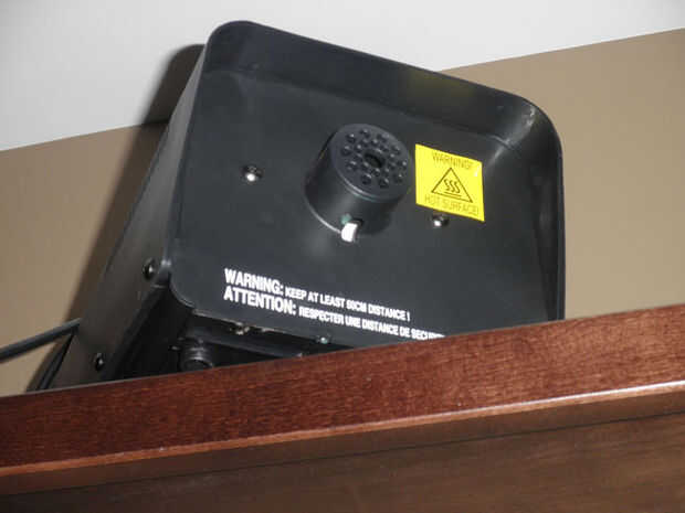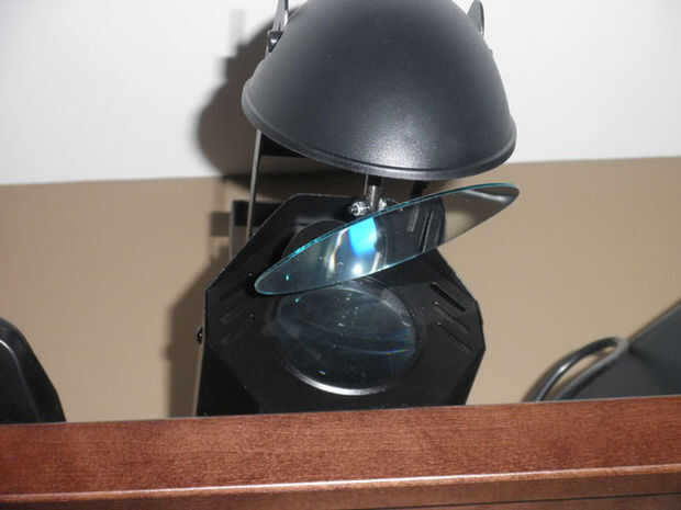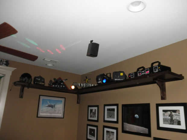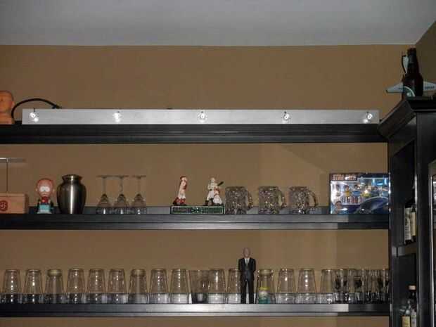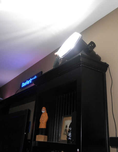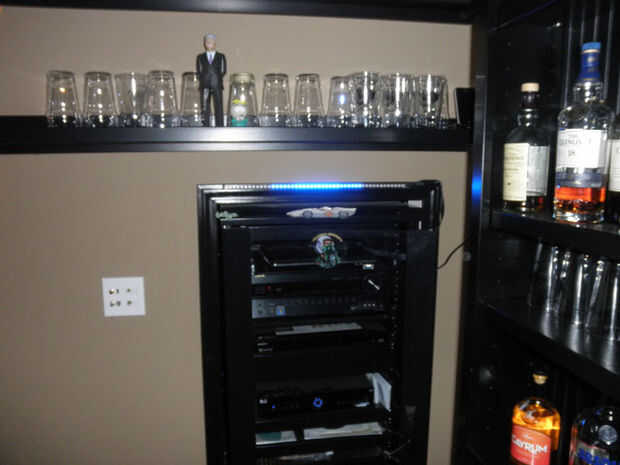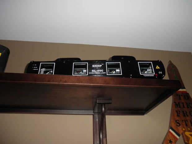 El escáner láser y todas las luces Chauvet pueden ajustarse para funcionar continuamente o a la música. El LED RGB tiras doble como iluminación del humor de debajo de la barra y puede activarse con un X10 separado remoto. No doy mucho pensamiento a exactamente qué tipo de luces para comprar, sólo traté de recoger uno de cada clase cuando vi a la venta. El signo de BetaBright prisma LED que recogí usado en eBay y usted puede programar para hacer un montón de cosas interesantes.