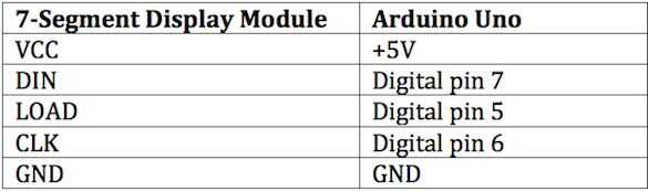El segmento siete LED display de 4 dígitos está conectado a Arduino Uno como se muestra en la tabla.