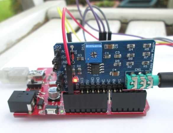 La configuración del hardware de este proyecto es bastante sencillo. Aquí están las instrucciones a seguir para configurar la conexión entre Arduino y fácil Plugin Pulse la pantalla. El módulo de Plugin de pulso fácil, coloque los 2 pines desviación puentes JP1 y JP2 a 5V las posiciones A0, respectivamente. Esta configuración permitirá el módulo a utilizar la fuente de alimentación de 5V de la placa Arduino Uno y conectar la señal de salida de pulso a A0 ADC canal la Arduino, cuando está enchufado a la placa Arduino Uno. Inserte al conector de sensor de pulso yema del dedo a la toma estéreo de 3,5 mm en el tablero de fácil Plugin de pulso. Asegúrese de que se inserta bien, como se muestra en la imagen siguiente. Luego plugin el módulo del sensor en el encabezado izquierdo de Arduino Uno tablero que los pines A0 y A1 del módulo sensor entran las clavijas analógicas A0 y A1 del Arduino.