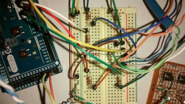 hice mi diseño original con resistencias de pull-down en los pines de entrada. Todo lo que he añadido recientemente incluye una resistencia de pull-down 10 k ohm, y he vuelto y he añadido desplegables para Arduino pernos 4-7 y 9. Ver tercera imagen de arriba. Ver http://arduino.cc/en/Tutorial/DigitalPins para aprender acerca de pull-up y las resistencias de pull-down para digitales pins de IO en su Arduino.