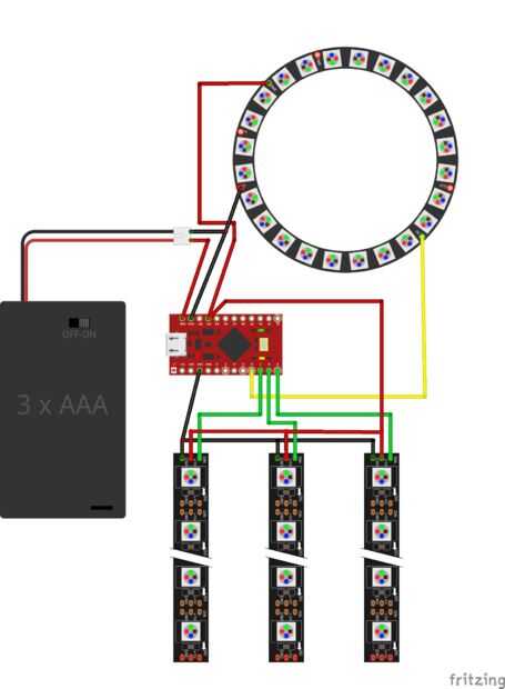 Conexión Arduino a los LEDs fue bastante directo. Porque yo no estaba planeando encender todas las luces a la vez, fui capaz de poder de las tres tiras y el anillo de los pernos de la energía en el Arduino. También quería animar las luces al mismo tiempo. Para ello pongo cada conexión RGB LED sobre su propio eje.