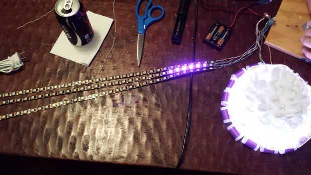 Porque quería ejecutar diferentes animaciones, al azar, al mismo tiempo en el anillo de NeoPixel y las tiras, ninguno de los ejemplos con llamadas a funciones dentro de la sección loop() funcionaría. Como resultado, terminé moviendo la lógica de la animación en el lazo, empujando las funciones a cada una de las tiras LED al mismo tiempo.