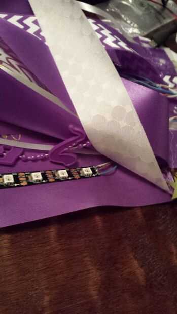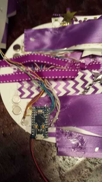 Una vez que tengas tu código y luces de trabajo, es hora de integrar a la madre y la electrónica. Usé una saludable cantidad de pegamento caliente para unir todo. El Arduino se intercala entre los círculos de Junta de cartel. La batería entonces estuviera pegada a la espalda de la mamá.