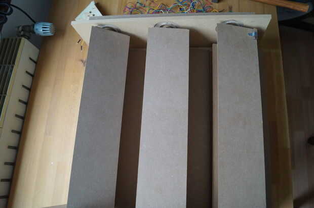 Esta parte es un poco complicada. Debe tener por lo menos 6 manos para hacer este paso. Así que ir pedir a algunos amigos ayuda. Ponemos la trasera interior en la mesa y los prismas en él. Tiró de los cables por la parte media de los rodamientos de bolas y luego por los agujeros en la caja piso. El siguiente paso es primera caja de piso de pegamento al panel y luego pegar el panel superior, también.