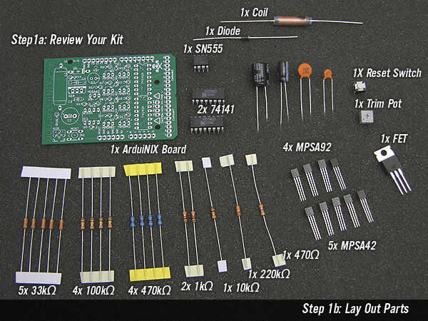 Bienvenido a la porción de montaje del sitio. Aquí llevaremos paso a paso en el proceso de construcción de su kit de ArduiNIX. En primer lugar, asegúrese de que tener todas sus piezas representaron!