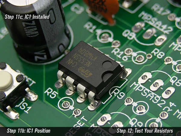 Hacer muy seguro de que el temporizador IC está orientado correctamente. La imagen en el tablero muestra hacia la abertura del punto o del plato está en un extremo de los ICs de temporizador.