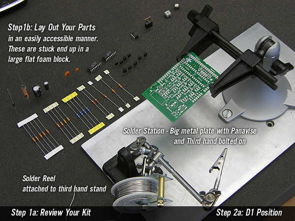 Permite diseñar sus piezas en una forma fácilmente accesible y organizada. No suministrar la estación de soldadura, pero sería muy útil si tuvieras algo parecido para montar tu kit con.  Mi estación de soldadura es una gran placa de metal con una Panavised y tercera mano ayudante de clip cocodrilo atornillada a ella.  Uno de los extremos de mi tercer ayudante de mano es modded para sostener mi carrete de soldadura.