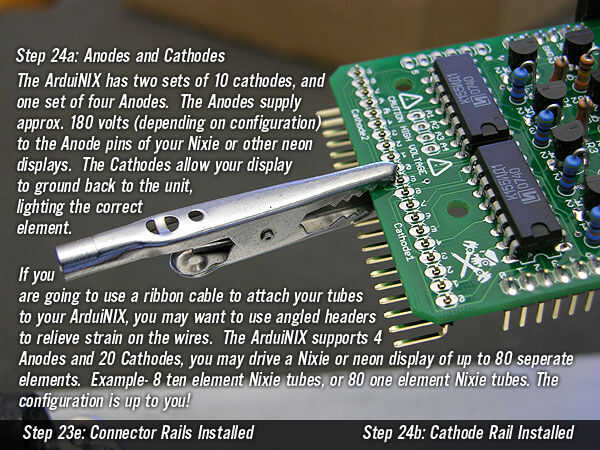 El ArduiNIX se conecta a los tubos nixie a través de estos terminales. Los cátodos se conectan a las placas números 0 a 9, y los terminales ánodo conectan al pin del ánodo del tubo nixie. SIEMPRE use un resistor entre el terminal de ánodo y el pasador del ánodo del tubo nixie. Esto es necesario. El valor de la resistencia varía en función de las trompas, pero 10 K trabaja bien para comenzar con.