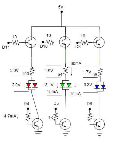 Esto establece los valores PWM para RGB a entre 0 y 255 y enciende y apaga los transistores corte 3. ¿Por qué utilizar un transistor de corte para cada color? Si usted algunas de sus luces de alambre a través del transistor corte y algunos directamente a la tierra esto le permitirá hacer más colores. Usted podría tener: R + B en una luz con sólo R en otro.