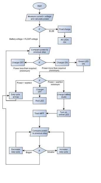 Para el MPPT el programa básicamente compara la potencia actual a la anterior, en la iteración anterior del código. La potencia se calcula basándose en la corriente y el voltaje medido de arduino. Si la tensión es demasiado grande, orquestado a la corriente, el ciclo de trabajo disminuye y viceversa.