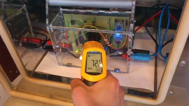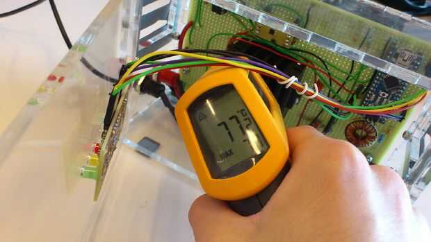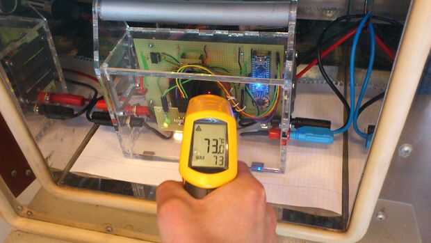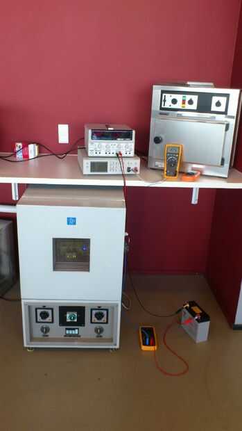 La prueba de temperatura se llevó a cabo en una cámara pequeña de la temperatura a 70 ⁰C. La configuración del cargador se coloca en la cámara y encendida. El circuito estuvo en operación hasta que la cámara de 70⁰C. Después de el cargador se dejó operar a 70⁰C durante 30 minutos. Después de la prueba la temperatura del disipador térmico se midió con un termómetro láser que mostró una temperatura de 77.2⁰C (imágenes).