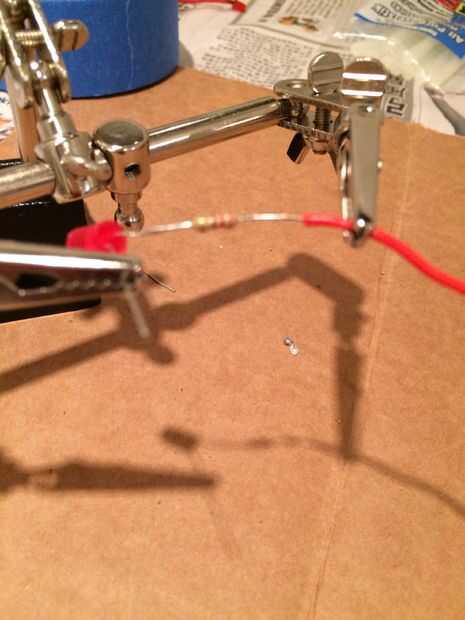 Ahora que ya tienes el circuito de prueba de funcionamiento y se ha programado la forma que desee, es momento de hacer una versión duro por cable de las conexiones del LED en la placa. Medida el cable desde donde usted desea que la luz a la torre donde se conectar al Arduino y protoboard, corte tanto un pedazo rojo y negro de alambre sobre esta longitud. Salir de la soldadura de hierro y empezar conectar las resistencias a los extremos positivos de los LEDs, luego un trozo de cable rojo a la resistencia de la soldadura y soldar un cable negro con el lado negativo del LED. Una vez que las conexiones son soldadas, cubrir los cables expuestos con tubería del encogimiento del calor y tomar un mechero junto a ellos para reducir el tamaño. Una batería de 9v es buena tener aquí así que usted puede probar las conexiones hechas para asegurarse de que funcionan.
