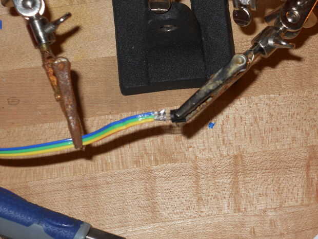 Ahora es el momento de instalar los sensores de temperatura. Usted necesitará instalar un sensor de temperatura en el interior del guante en la parte inferior del dedo indicador. Todo lo que tienes que hacer es coser un hilo alrededor del cable mientras está bajo el guante. Les pido disculpas. Cambié a hilo negro así que no sería notable pero ahora no se puede ver en la imagen. Lo siento. El cable debe llevar en la parte inferior del protector de borde de la muñeca del guante. Hacer lo mismo con el el segundo sensor de temperatura, que se colocará en el mismo lugar justo en el dedo anular.