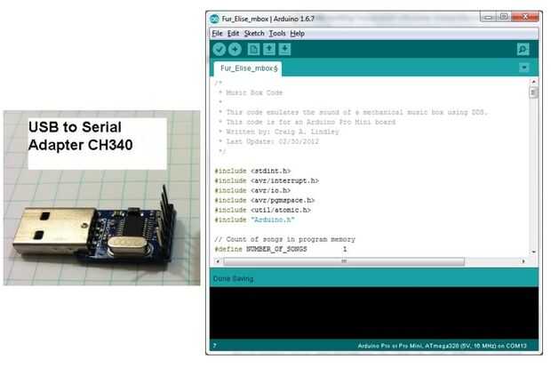 4. Conecte la placa Arduino Mini Pro al adaptador USB y cargar el sketch a la placa Arduino Mini Pro. Hacer que una orientación pin del adaptador USB y partido de tablero de Arduino.