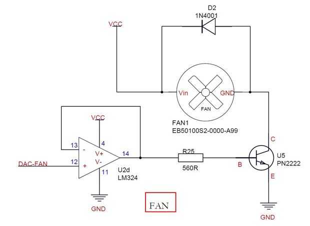 Así que, en definitiva, podemos controlar cuánto actual el transistor permitirá a través del ventilador funcionar mediante el control de la cantidad de base actual que ponemos a través del transistor. Como la base del transistor es una resistencia fija podemos controlar cuanta corriente se aplica cambiando el voltaje aplicado. Esto es lo que el segundo canal de la DAC para, si recordáis, ya hablamos que un op-amp se puede utilizar como un buffer, que es exactamente lo que está haciendo U2d para nosotros. Como un DAC no muy corriente para el transistor (aproximadamente 15mA), tenemos que poner su tensión en un búfer para que el amplificador operacional puede suministrar la base actual en su lugar. El CAD probablemente podría hacerlo pero sería muy cerca de su límite y no estoy en la costumbre de dañar chips cuando tenemos un op-amp repuesto para hacer el trabajo y proveer en el orden de 30 mA.