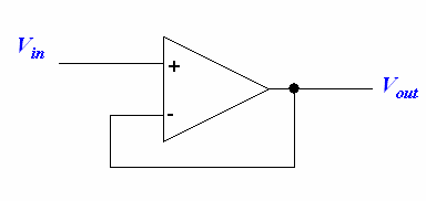 Los restantes 3 op-amps en nuestro circuito se utilizan como buffers, el propósito de un tampón es detener cualquier corriente que fluye desde o en una sección de un circuito que no está diseñado para hacerlo. Porque un op-amp tiene una independencia de entrada muy alta dibujan muy poca corriente de la porción del circuito a que están conectados. Un tampón está conectado como se muestra en la segunda foto de arriba y puede considerarse como un amplificador con una ganancia de 1, si volvemos a nuestra anterior propiedad de un op-amp, que hará lo que puede en su salida para hacer dos entradas iguales, en el caso de la memoria intermedia, la salida está conectada directamente a la entrada inversora del amplificador operacional , por lo que cualquier tensión que se aplica a no invertir de entrada del op-amp lo conducirá a su salida por lo que es igual.