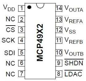 Los pernos para el MCP4922 son las siguientes,