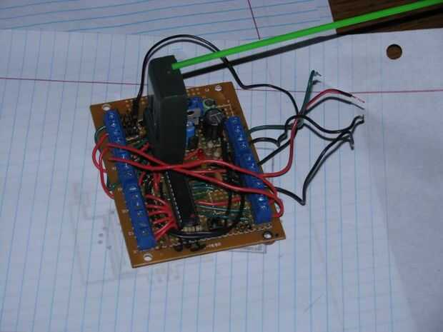 Para facilitar las cosas, construí un tablero de breakout basados en Arduino usando perf-tablero de Radio Shack, una toma de 28pin DIP, un oscilador de 16mhz y un poco de alambre. También he añadido un conjunto de encabezados de mujer de tal manera que puedo conectar mi receptor de R/C directamente sobre el tablero de arranque. Para conexiones seguras al césped, agregué terminales de tornillo en cada pin de salida y cada uno de los 6 canales del receptor. También tiene un regulador de 5v para alimentar tanto el Atmega168 de Arduino y el receptor RC (que obtiene energía cuando se enchufa en la placa de arranque). Así que usted sólo ruta los cables puente de los canales que desea utilizar en el receptor, a los pines digitales de Atmega 2 y 3. También he añadido 2 luces LED que son difíciles de atado con alambre a los pines digitales 12 y 13 para las luces de neutro para cada canal para que pueda ver fácilmente cuando estoy en neutral.
