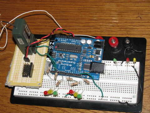 Empecé por control de 3 LED con 1 canal en un protoboard. Conectado un LED rojo que adelante (pin digital 9), un LED amarillo para el retroceso (digital pin 5) y un LED verde para el neutro (digital pin 12). Esto le permite ajustar el código para adaptarse a las necesidades de su sistema de radio. Tienes buen 0-100% control PWM de ambos LED y la luz neutral se enciende cuando la palanca de control está centrada. Si es necesario, puede ampliar el margen de oscilación para el neutro, pero al hacerlo, aumentará la velocidad en el encendido (que comienza en 0%, por lo que probablemente sería deseable). Ver fotos.